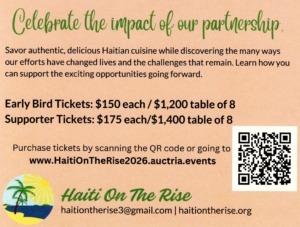 We look forward to seeing you on Saturday, April 11th. If you are unable to attend that evening but would like to support Haiti On The Rise in some manner, please visit our DONATE page. Thank you for your interest in Haiti On The Rise for it is people like you who enable us to do our humanitarian work in Haiti.